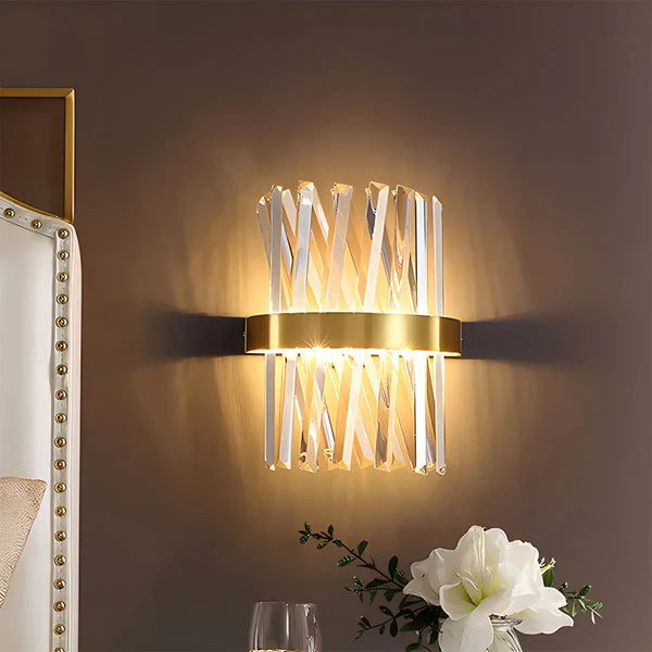 The Virlano Crystal Wall Light blends luxurious design with modern functionality, making it a statement piece for any room. Featuring a golden metal frame adorned with shimmering crystal and glass details, this wall light delivers both elegance and atmosphere. Perfect for bedrooms, living rooms, or hallways, it offers the option of warm white (3000K) or cool white (6000K) lighting to suit your mood. Its sculptural form adds a sophisticated accent while providing effective illumination. Designed for easy wall installation, this light ensures a striking effect whether placed alone or in pairs.