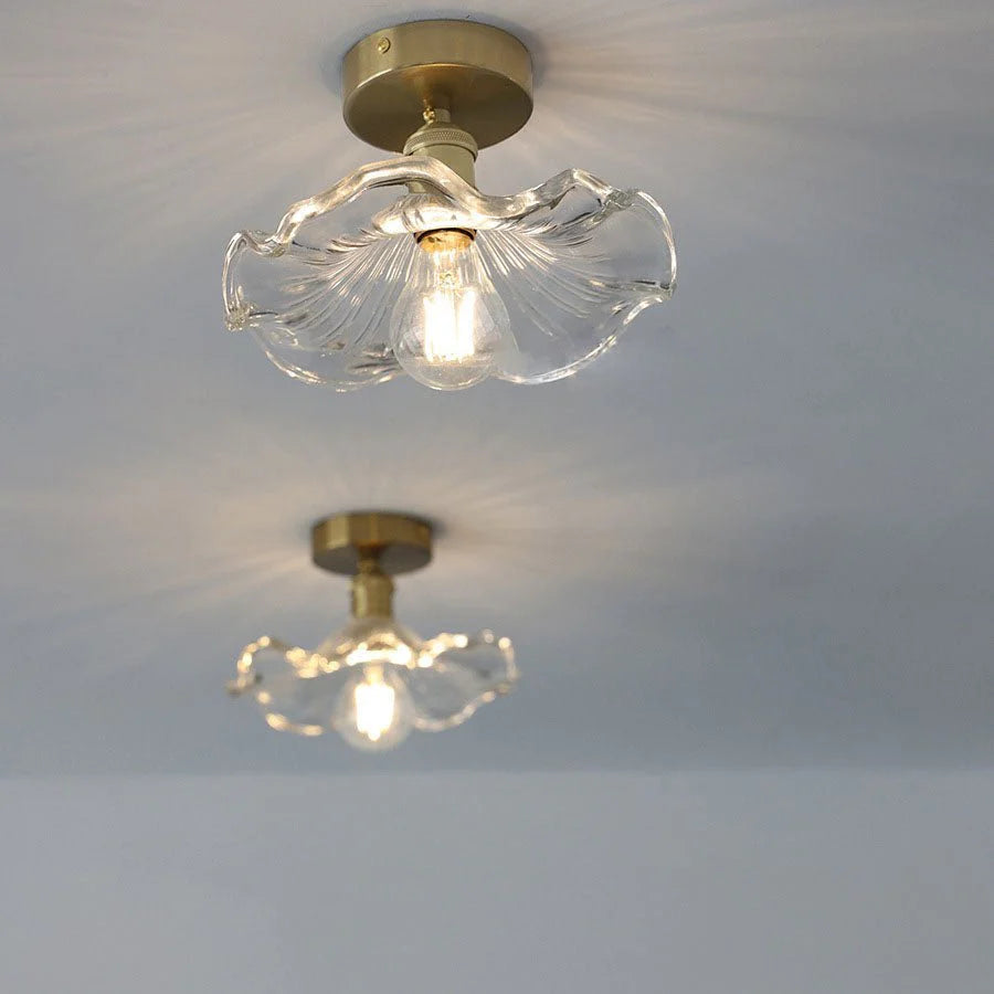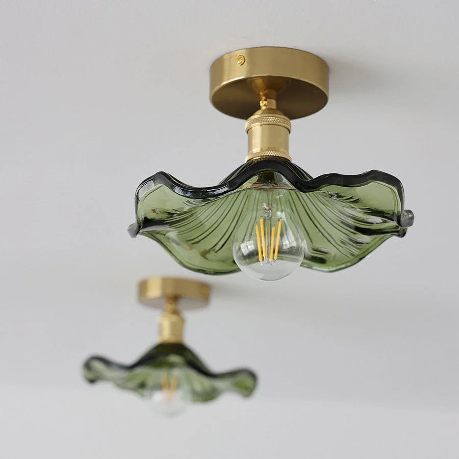 The Linzena Flower Ceiling Light is a beautifully shaped semi-flush mount light, inspired by the elegance of blooming petals. With its wavy glass shade in either clear or green and a brass-finished base, this ceiling light adds vintage charm and texture to hallways, bedrooms, or living spaces. Compatible with E26 bulbs and available for both 110V and 240V systems, it's a perfect choice for homes seeking soft ambient lighting with a decorative twist. Easy to wire and install, the Linzena enhances interiors with a subtle botanical character and timeless glasswork.